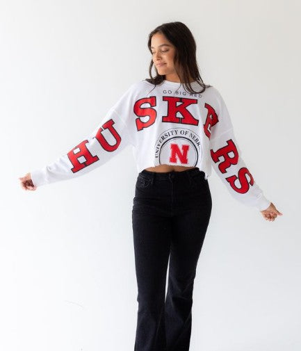 Our Cropped Long Sleeve Crewneck! A GDS favorite featuring a raw hem, dropped shoulder, and the perfect lightweight material. It fits like a dream and adds a girly touch to your collegiate wardrobe. Pairs well with denim shorts and cowboy boots for game day!